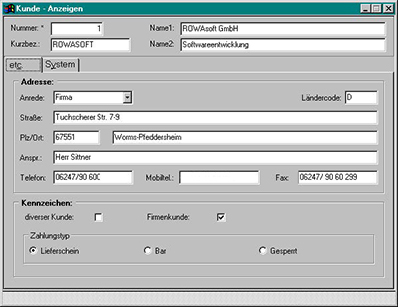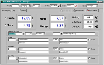 Die Wägemaske ist auf schnelle Eingabe optimiert, sie kann komplett mit der Tastatur bedient werden. Von der Wägemaske aus hat der Bediener vollen Zugriff auf die Stammdaten. Er kann Stammdaten suchen, ändern und auch erfassen, ohne die Wägemaske verlassen zu müssen. So kann z. B. ein neuer Kunde angelegt werden, während der Lieferschein erzeugt wird, einfach durch den Wechsel in die Kundenmaske. Selbstverständlich prüft die Benutzerverwaltung, ob der Bediener über die notwendigen Rechte verfügt.