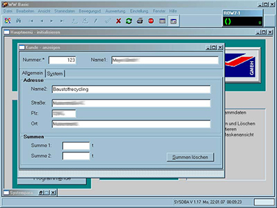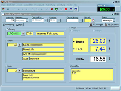 Das Wägeprogramm ermöglicht eine Stammdatenverwaltung (Kunden, Fahrzeuge, Sorten), im Wägebetrieb wird das Gewicht eichfähig von der Waage übernommen und in die entsprechenden Masken eingefügt, der Wägeschein ausgedruckt und eine Auswertung erstellt.